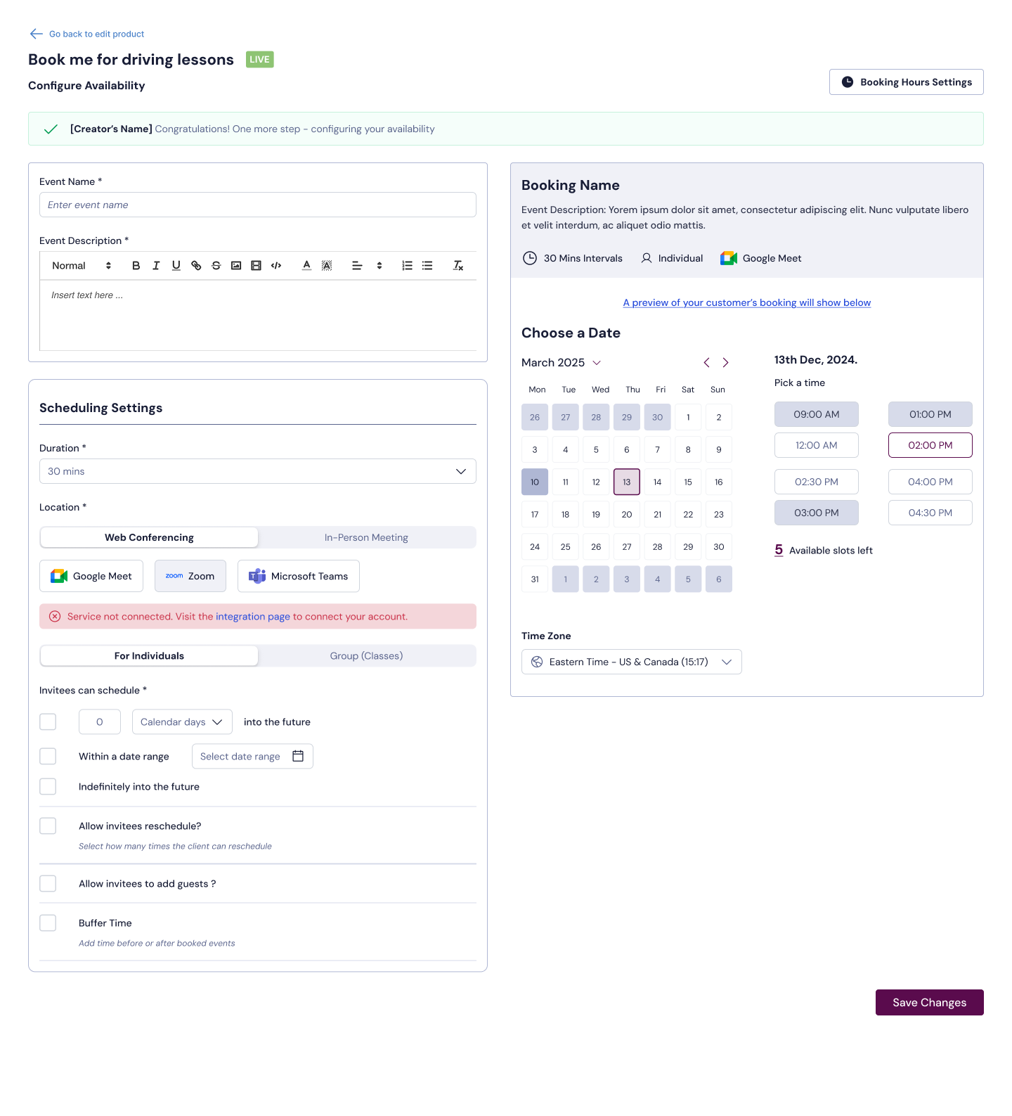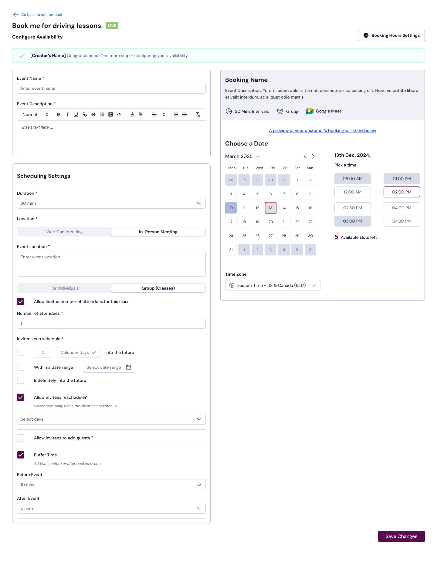 Once completed, click Save and Set Up Booking Availability