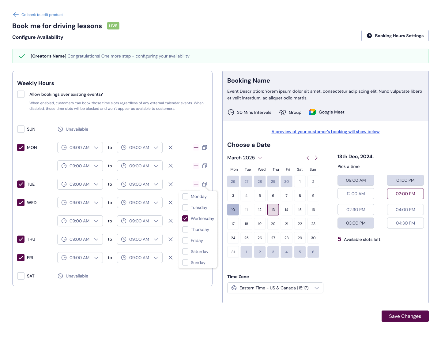 Once saved, your booking product becomes live